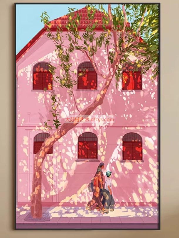 老上海街景 现代手绘装饰画客厅高级感餐厅多巴胺粉色挂画卧室艺术画