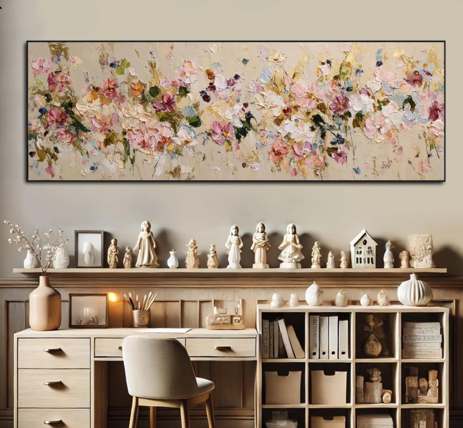 大型全景金箔花卉纹理墙画粉色花卉油画客厅墙面装饰画,现代抽象花卉帆布装饰画 卧室油画